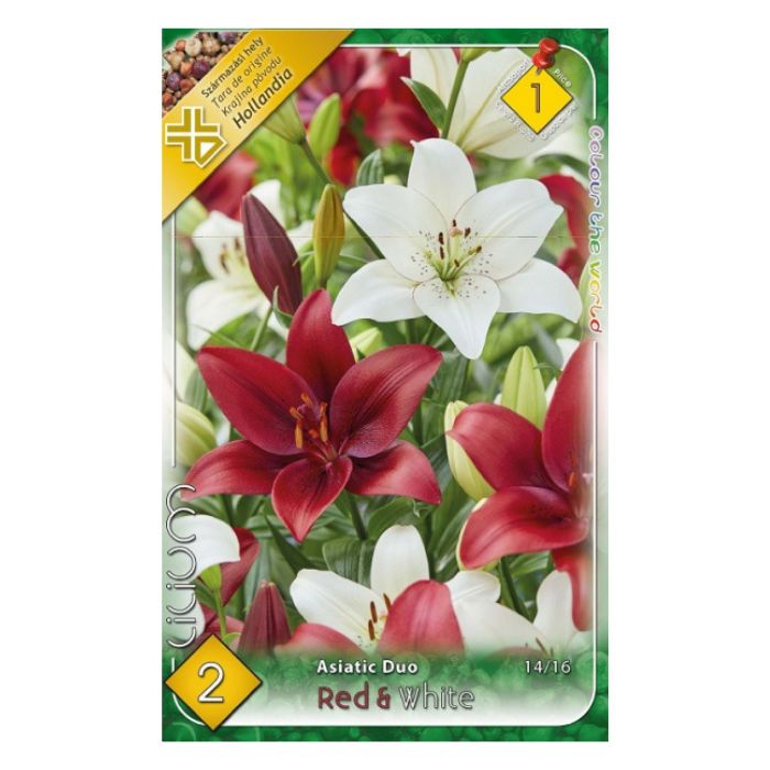 A Lilium (Asiatic Hybrid) ‘Duo Red & White’ egy látványos, kétszín-hatású ázsiai hibrid liliom válogatás: a csomagban piros és fehér virágú hagymák együtt adnak kontrasztos, elegáns összképet. Kb. 60 cm magasra nő, virágzása június–júliusban várható. Erős szárú, megbízhatóan virágzó hagymás évelő, ágyásban és vágott virágként is nagyon jól használható.