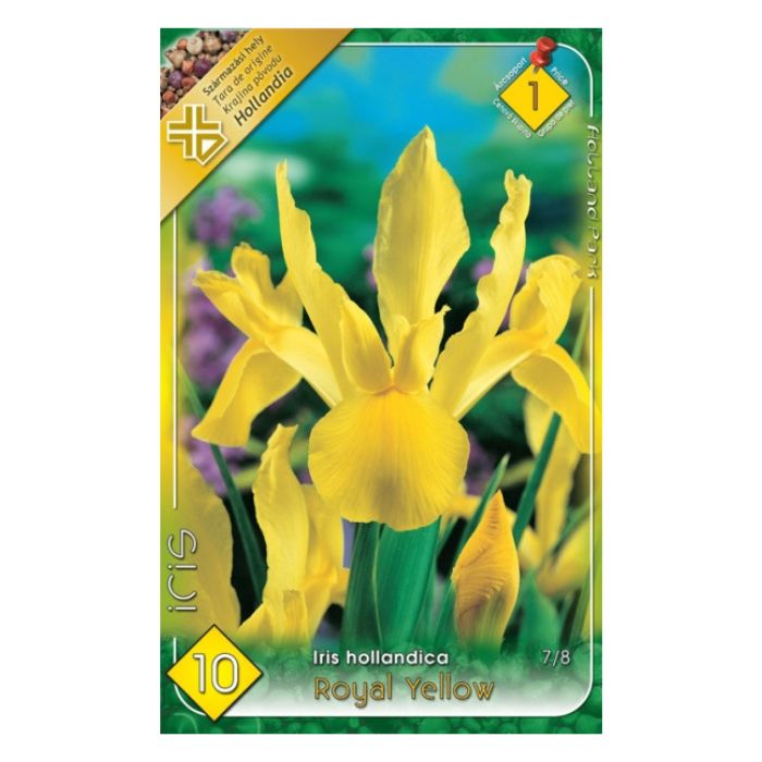 Iris hollandica ‘Royal Yellow’ sárga holland írisz. 40–60 cm, virágzás: június, nap/félárnyék, télálló. Kiszerelés: 10 db, méret: 7/8.