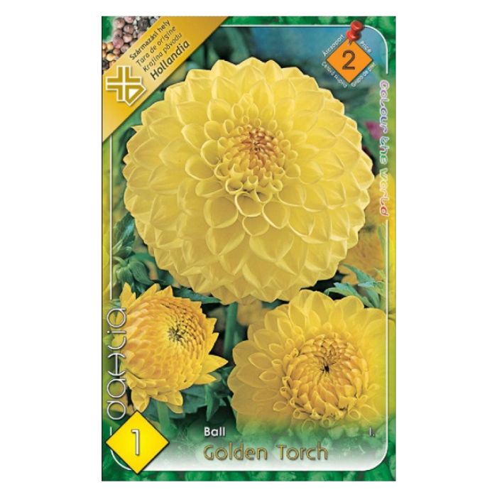 Dália ‘Golden Torch’ (Dahlia) labda dália, nagy, telt gömb virágokkal és tiszta, aranysárga színnel. A labda dália gumó különösen jó választás vágott virágnak, mert a tömött virágfejek sokáig tartanak, és az évelőágyban is elegáns, rendezett hatást ad. Kb. 60 cm magasra nő, napos fekvésben virágzik a legbőségesebben, júliustól októberig folyamatosan nyílik.