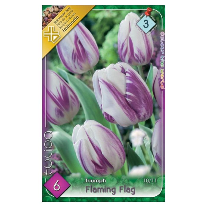 A Tulipa Flaming Flag a Triumph csoportba tartozó, rendkívül dekoratív, középkorai virágzású tulipánfajta. Látványos fehér szirmait lilás-bordó lángnyelvek díszítik, amelyek már messziről is megragadják a tekintetet. Erős szárának és telt virágának köszönhetően vágott virágnak is kiváló választás.
