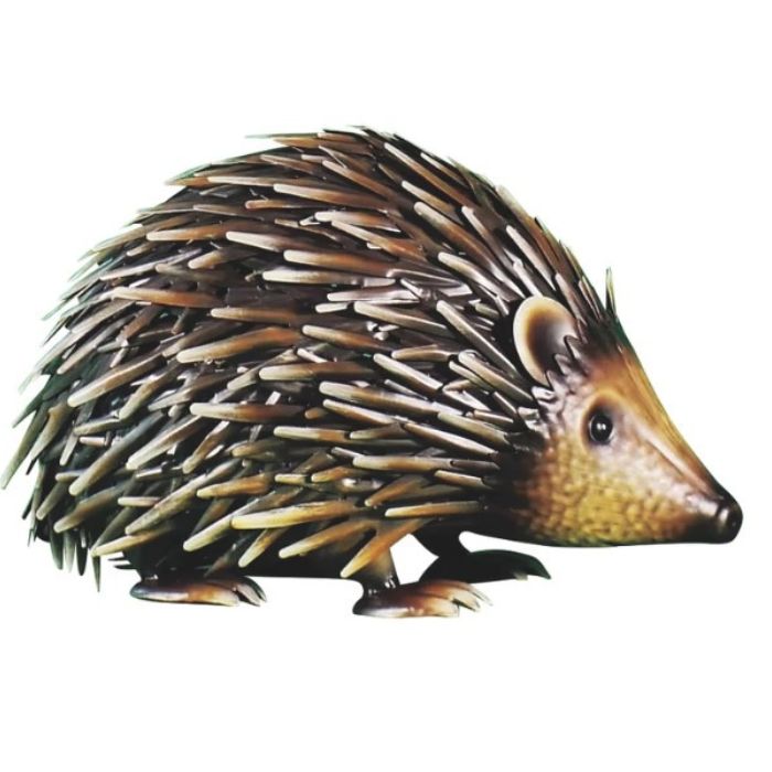 HOGY stílizált dekoratív sün figura festett fémből, 26×16×16 cm. Színes, természetes hatású kerti dekoráció teraszra, balkonra, udvarba.